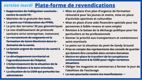 Lors de la rencontre, quatre points ont été débattus : la suppression de l’obligation vaccinale, le départ de la DGS, le point sur l’élaboration du PPRN, l’éclaircissement de la situation de la famille Webster à la baie orientale.Le préfet a par ailleurs expliqué qu’il n’était pas compétent pour répondre à certaines revendications comme l’achat de matériel ou le recrutement de personnel soignant, il s’agissait de décisions appartenant aux directions des établissements concernés et à l’ARS. Il a précisé que le projet de centre médico-social était en cours et que le transfert de la compétence environnement à la COM est une décision que seul le gouvernement peut prendre. Il a en outre fait remarquer qu’aucune des personnes ayant manifesté le vendredi 3 septembre n’avait fait l’objet de poursuites.