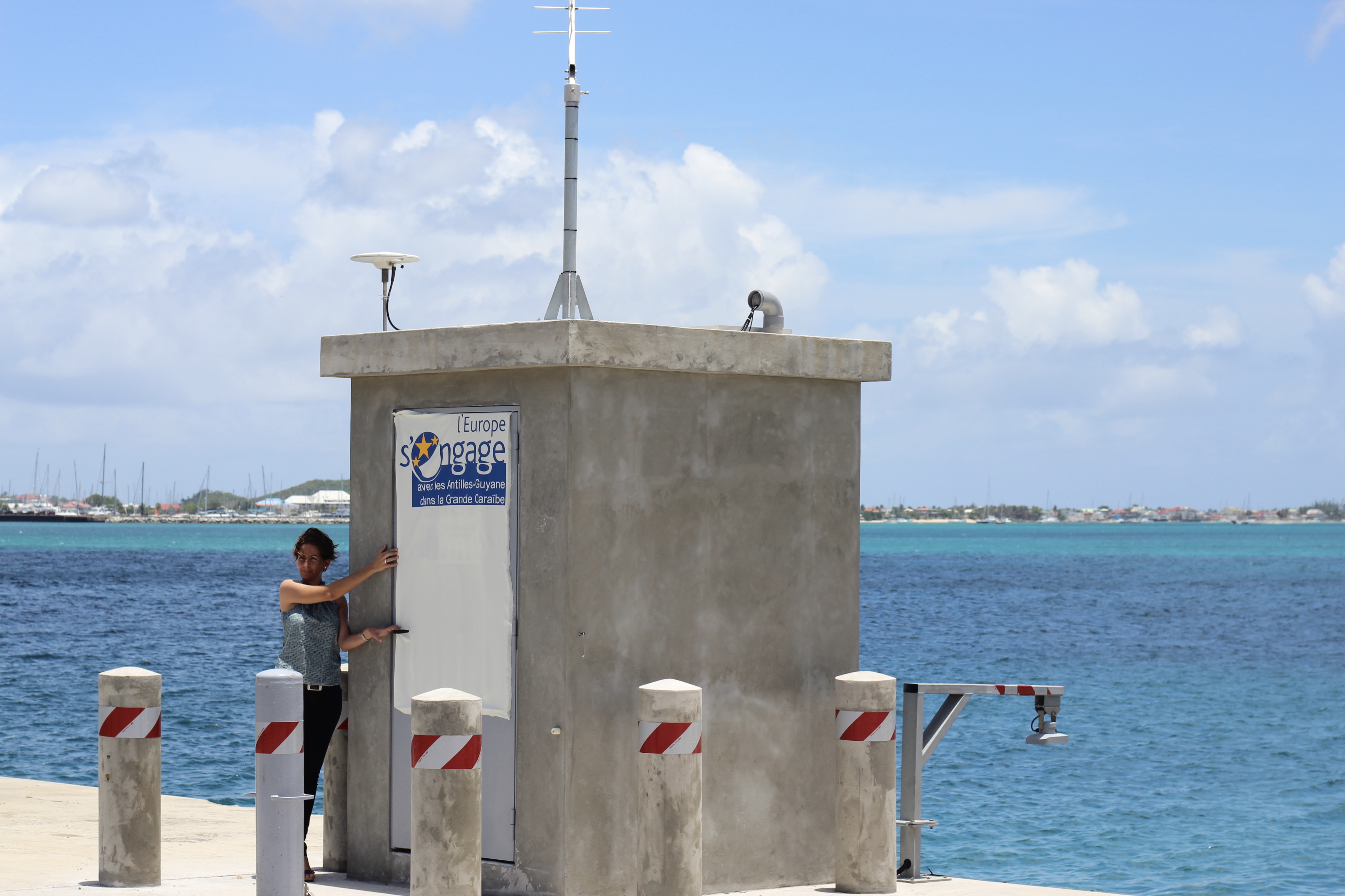 - La mise en place d’une station marégraphique permettant de renforcer les capacités de prévention des risques de tsunami et de submersions marines pour la région a quant à elle bénéficié de 75 000€ de subventions FEDER pour un coût total estimé à 100 000€. Parfaitement autonome, cette station située à l’extrêmité du port commercial de Galisbay, fonctionne grâce à des panneaux solaires. Ce projet est réalisé en coopération avec Saint-Barthélemy qui inaugurera bientôt la sienne au port de Gustavia. Le marégraphe permet d’améliorer le dispositif d’alerte en cas de risque de tsunami et de surveiller la montée du niveau de la mer. L'acquisition de données est réalisée grâce à un double dispositif qui permet de recueillir le même type de données, de deux façons différentes. Un radar placé au-dessus de la surface mesure la hauteur de l'eau en calculant le temps écoulé lors de la réflexion de l'onde qu'il émet. Une sonde de pression placée au fond de l'eau mesure la hauteur de la colonne d'eau grâce à la pression qui s'exerce au-dessus d'elle. Ces données sont transmises en temps réel sur le satellite GOES qui les achemine vers les fournisseeurs de service au tsunami. Ces données sont transmises également en temps réel via la 3G afin d'être interprétées et analysées par les partenaires scientifiques (OVS/IPGP, SHOM, IGN). Un GPS est placé sur la station dont les données sont visibles entre autres, sur les site Sonel.org et IOC-SEALEVELmonitoring. Le premier ministre de St. Maarten a annoncé que s’ajouteraient bientôt d’autres stations à St. Maarten (Pointe Blanche et Simpson Bay).