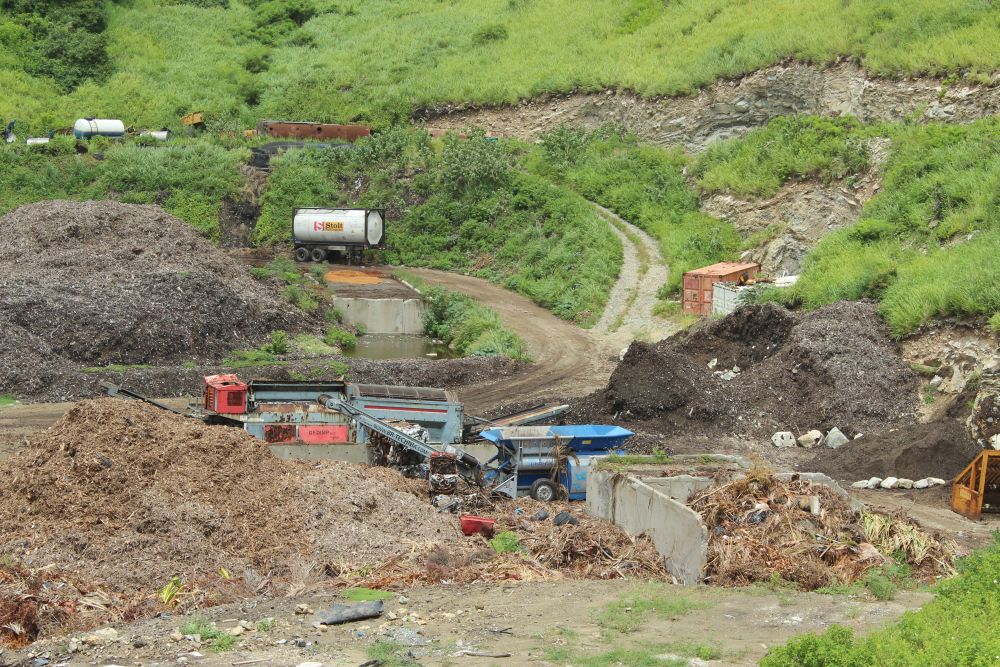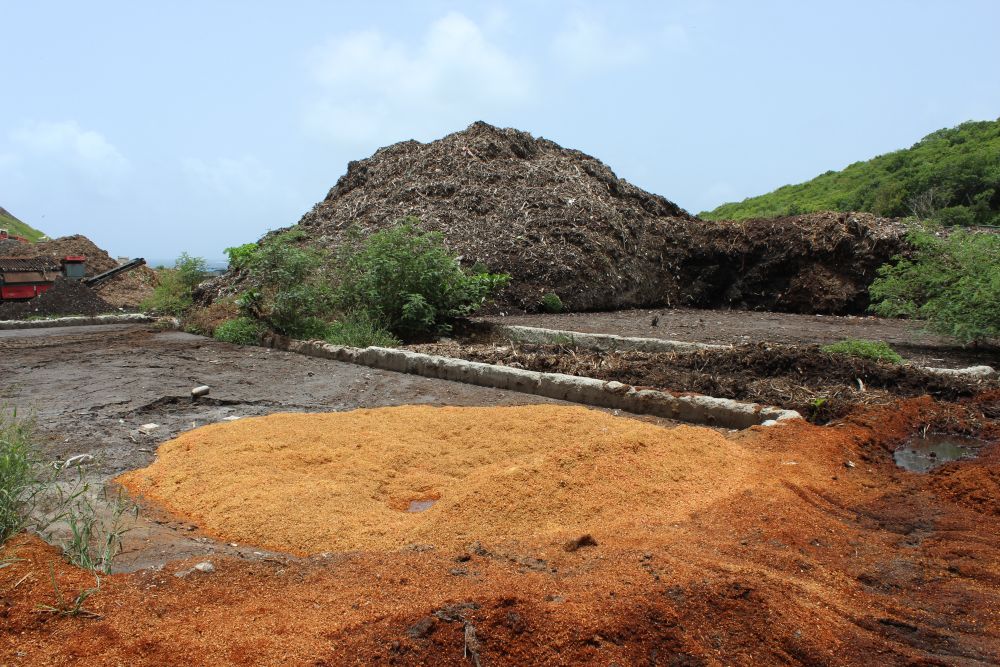 Les sargasses sont stockées tout en haut de la décharge par tas, en plein air, le temps de sécher. Une étape qui nécessite qu’elles contiennent le moins de sable possible, c’est pourquoi Verde Sxm ne recycle que les sargasses collectées à la main. Elles sont ajoutées aux autres déchets végétaux qui sont broyés, et ne représentent que 5% du volume total de déchets verts. Le broyat est humidifié pendant quelques jours dans une fosse contenant les déchets des stations d’épuration, des fosses septiques et bacs dégraisseurs.