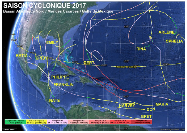 En 2017, dix-sept phénomènes ont été nommés dont dix ouragans et sept tempêtes tropicales, rapporte Météo France dans une synthèse chiffrée de la dernière saison cyclonique. Six ouragans ont été majeurs, c’est-à-dire qu’ils ont atteint la catégorie 3 avec des vitesses de vents comprises entre 178 et 210 km/h. Il y a eu Lee et Ophelia en catégorie 3, Harvey et José en catégorie 4, Irma et Maria en catégorie 5. «Dix-sept cyclones baptisés, c’est rare. Ce n’est arrivé que huit fois auparavant. La normale se situe autour de 12 cyclones nommés par an et le record lors de la saison 2005 est de 28», note Météo France. «Voir évoluer dix ouragans dont six majeurs en une saison est également rare mais pas exceptionnel. Cela s’est aussi déjà produit huit fois auparavant avec un record de quinze ouragans en 2005 dont sept ouragans», poursuit-il.