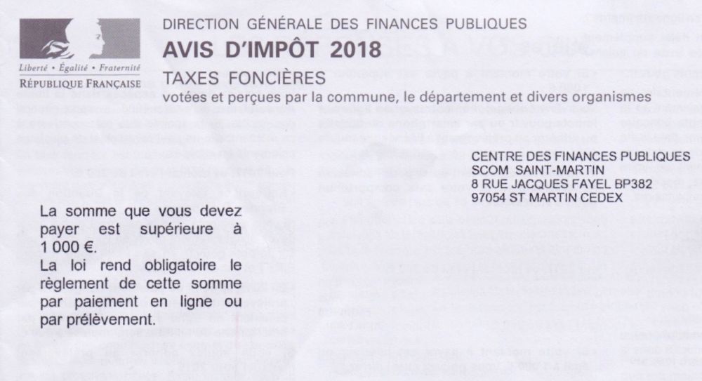 Compte tenu des délais de transmission des avis de taxe(s) foncière(s) 2018, le Centre des finances publiques de Saint-Martin précise que la date limite de paiement de cet impôt est repoussée au 15 novembre 2018. Elle était initialement prévue le 15 octobre.