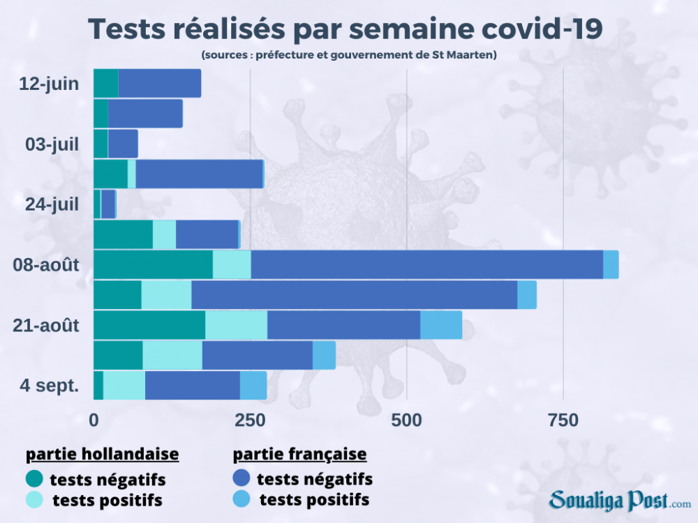 Toujours entre le 31 juillet et le 4 septembre, 2 760 tests PCR ont été effectués sur toute l’île : 1 856 en partie française (dont 61 % sur les deux premières semaines d’août en raison de la campagne de dépistage gratuite menée dans les quartiers par l’ARS et la préfecture) et 904 en partie hollandaise. Le taux de positivité de Sint Maarten est quasiment quatre fois supérieur à celui de la partie française : 42,4 % contre 11 %.