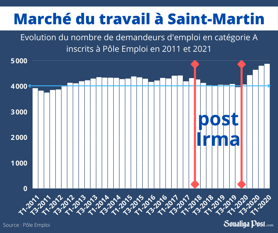 En raison du caractère saisonnier du marché du travail à Saint-Martin, une hausse du nombre de demandeurs d’emploi est systématiquement observée à la fin de la saison touristique jusqu’à la prochaine. Toutefois cet effet n’a pas été constaté entre fin 2017 et début 2020, soit durant la période de reconstruction post Irma. Durant les trois trimestres de l’année 2018, une baisse trimestrielle variant de 1,5 à 3,2 %, était notée. Puis un maintien durant près d’un an. Comme le montre le graphique ci-contre, le chômage avait atteint l’un des ses niveaux les plus bas de la décennie.