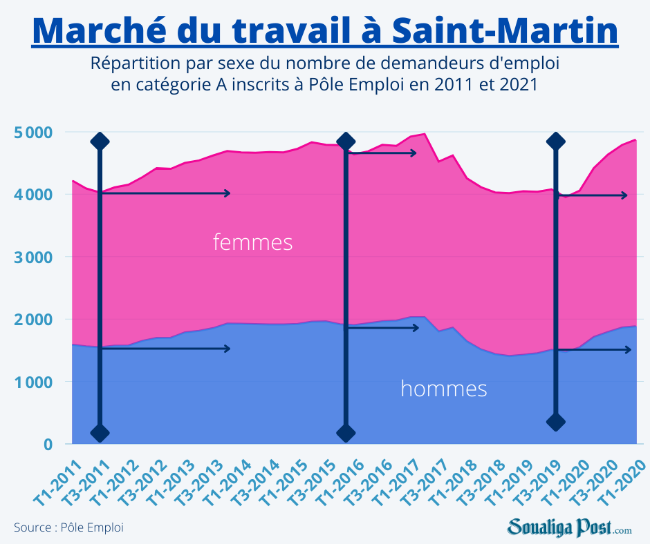 A fin mars 2021, ils sont 1 745, soit 285 de plus qu’il y a un an (19,5 %). Ils représentent 36 % des demandeurs d’emploi en catégorie A. Ils sont 1,9 fois plus nombreux qu’il y a dix ans. Tout comme pour les autres catégorie d’âge, la période de reconstruction post Irma avait généré une baisse des seniors à la recherche d’un emploi. Mais hormis cette période de quelques mois, le chômage des personnes de plus de 50 ans n’a jamais cessé de progresser pour atteindre un niveau record aujourd’hui.