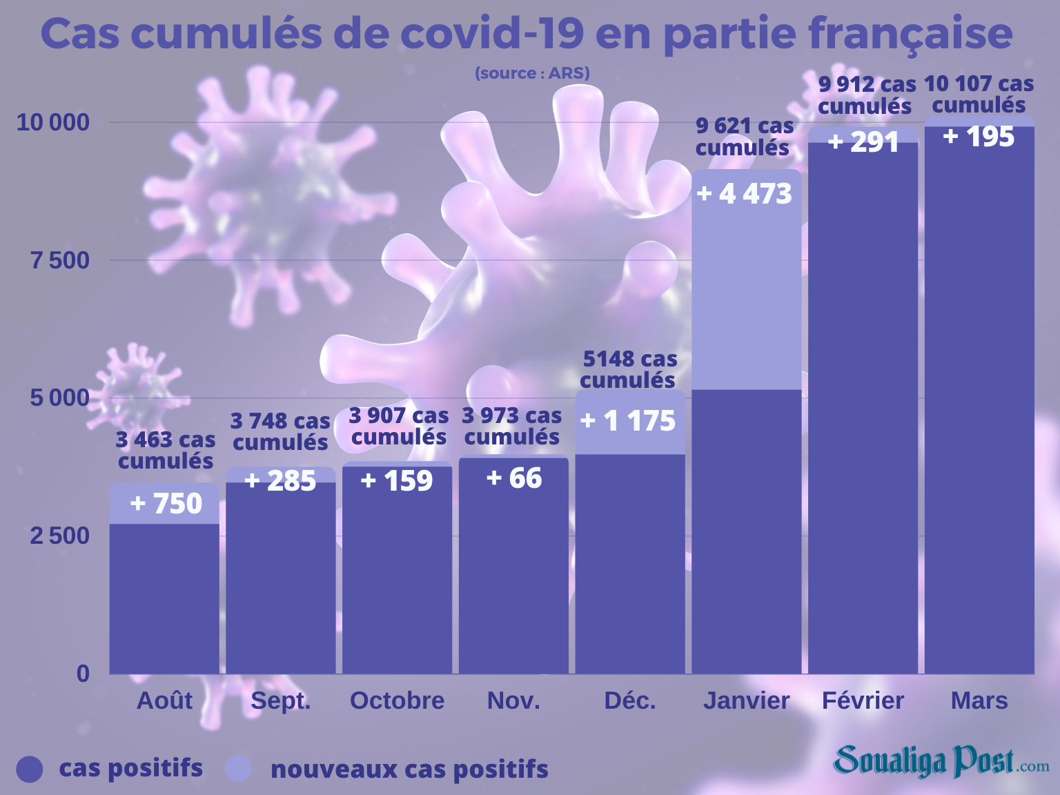La barre des 10 000 cas de covid-19 a été franchie en mars en partie française. Le dernier bulletin sanitaire fait état de 10 107 cas au 27 mars. 195 personnes ont été testées positives le mois dernier contre 291 en février. Il s’agit du nombre de contaminations le plus bas depuis novembre.