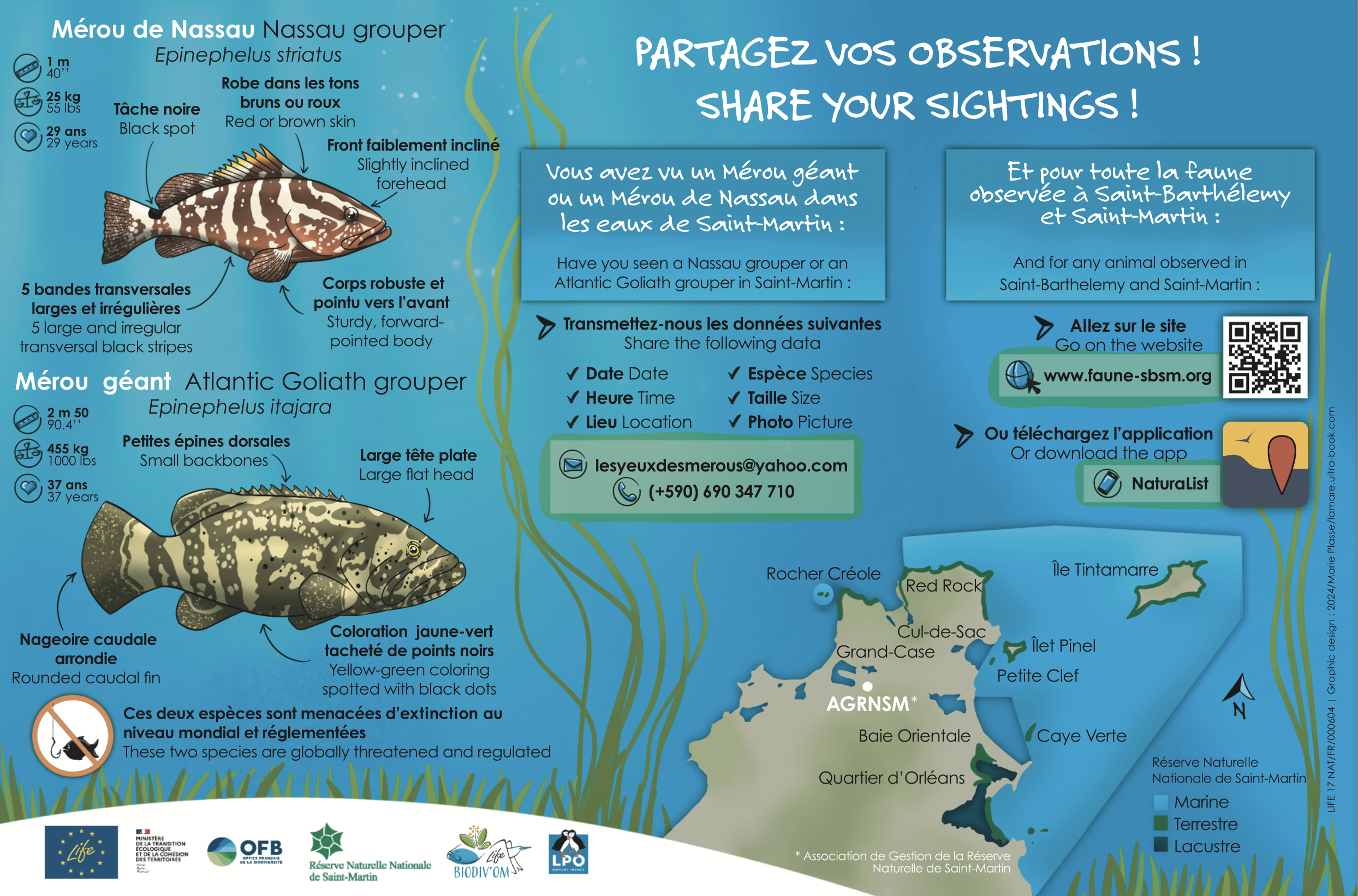 Une étude de la colonisation larvaire a été réalisée grâce à la mise en place d’un dispositif lumineux, inédit. Durant sept mois, à chaque nouvelle lune, les observations n’ont cependant pas permis de détecter despécimens dans les eaux saint-martinoises. Des suivis ichtyologiques (étude des larves et des poissons en plongées) ont également été menés et six « Biohut », des habitats pour poissons de petites tailles, ont été installés sur des herbiers sous-marins sur trois sites différents. Durant trois ans, si aucun mérou géant n’a été détecté, la présence de mérous de Nassau juvéniles a pu être observée.En parallèle, une étude socio-économique a été menée et 223 animations dans les établissements scolaires ont permis de sensibiliser 3429 élèves.