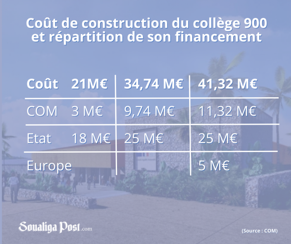 Au final, entre 2019 et 2025, le coût du collège 900 a progressé de plus de 20,3 millions d'euros, passant de 21 millions à 41,3 millions d'euros. Ces 20,3 millions supplémentaires sont financés par l'Europe (5 millions), l'Etat (7 millions au titre du FPRNM) et la COM (+8,32 millions d'euros). La part du ministère de l'Education est passée de 7,5 millions en 2019 à 15 millions en 2023, depuis elle n'a pas évolué.