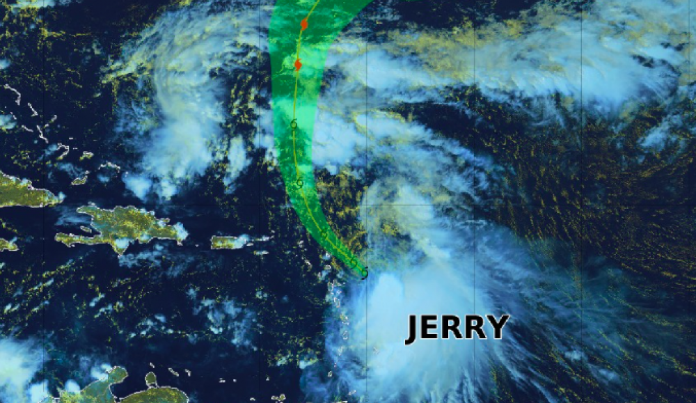 Grâce à des conditions environnementales favorables, Jerry devrait se renforcer progressivement pour devenir un ouragan de catégorie 1 samedi et adopter une trajectoire Nord tout en s'éloignant de l'Arc Antillais. Il passera au large des Îles du Nord à une distance comprise entre 65 et 160 km des îles.
