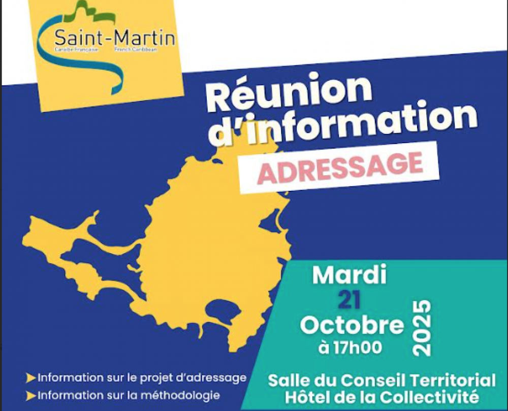 La Collectivité organise une réunion publique en partenariat avec La Poste, sur l’adressage, mardi 21 octobre à 17h, à l’hôtel de la Collectivité à Marigot. La réunion est ouverte à tous et a pour but d’informer le citoyen des projets en cours et à venir visant à optimiser ce service d’utilité publique. Elle sera animée par Rosette Parotte, cheffe du service recensement de la population et adressage au sein de la COM et Arlette Gros-Desormeaux, cheffe de projet adressage du groupe La Poste.