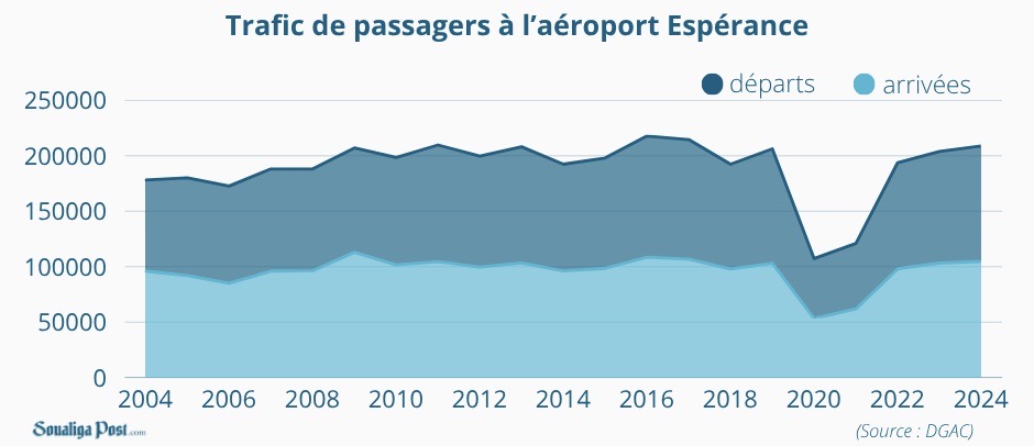 Le trafic de passagers à l'aéroport Espérance à Grand Case s'est élevé à 208 845 passagers en 2024 dont 104 138 au départ et 104 707 à l'arrivée. Il progresse de 2,4 % par rapport à 2023 avec 4 876 passagers supplémentaires. C'est en août que le flux de passagers le plus important a été enregistré (27 681, soit 13,3 % de la fréquentation totale).