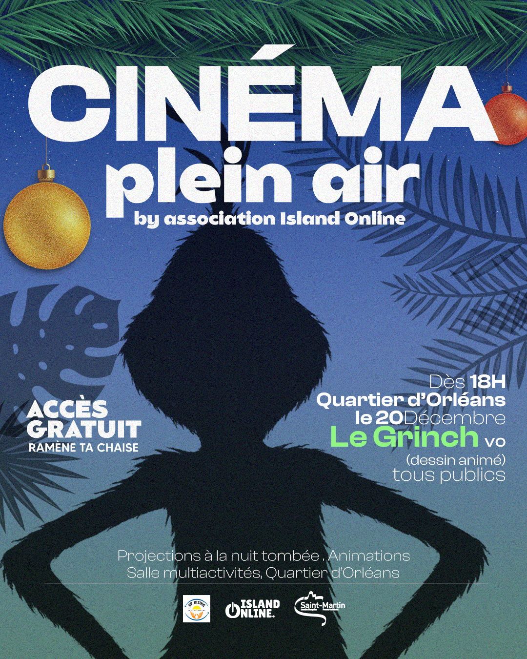 Le samedi 20 décembre, Island Online propose une séance de cinéma en plein air gratuite avec la projection du film Le Grinch, à partir de 18h, sur le parking de la salle multi-activités de Quartier d’Orléans.