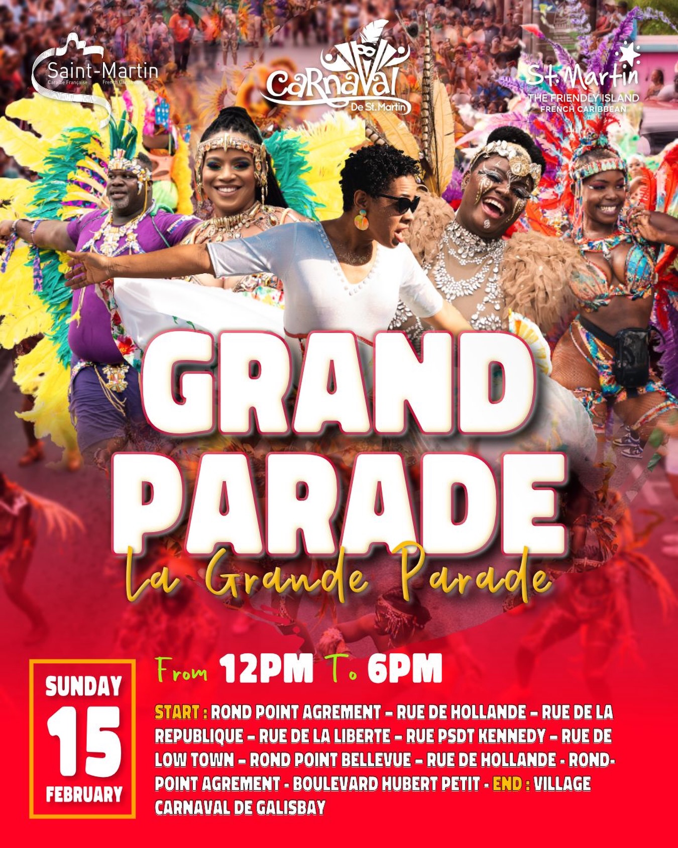 Le lendemain, dimanche 15 février, ce sera l’heure de la Grande Parade ! De midi à 18 heures, les carnavaliers défileront dans les rues de Marigot. Comme pour le Jouvert, le départ se fera au rond-point d’Agrément. La parade traversera ensuite la rue de Hollande, la rue de la République, la rue de la Liberté, la rue Kennedy, la rue Low Town, le rond-point de Bellevue, puis remontera de nouveau la rue de Hollande jusqu’au rond-point d’Agrément et le boulevard Hubert Petit pour enfin s’arrêter au village du carnaval de Galisbay.