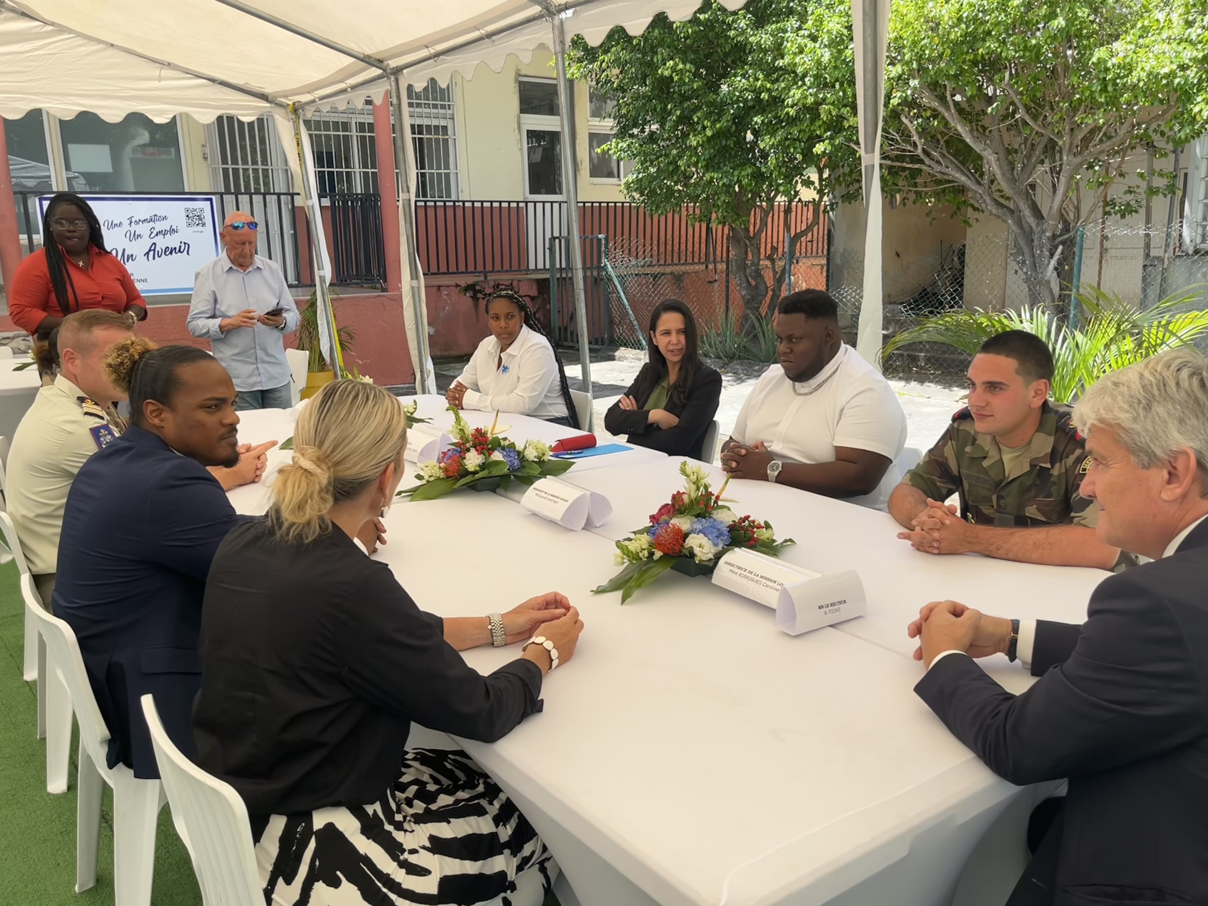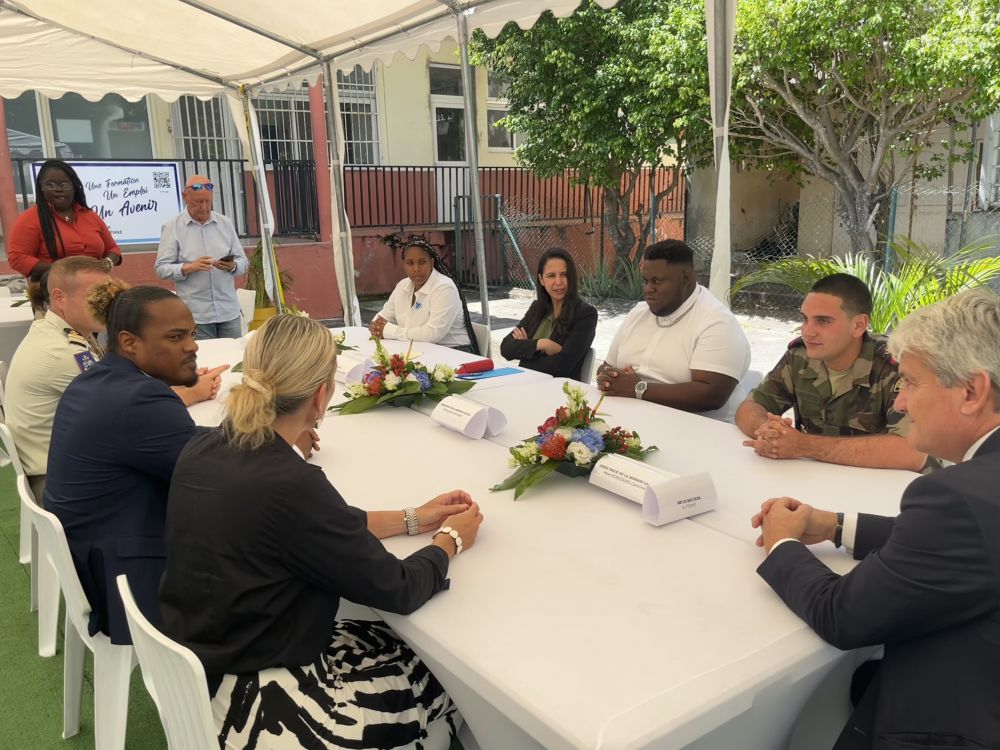 Naïma Moutchou s’est ensuite déplacée à Marigot, où elle a pu découvrir les locaux de la Mission locale ainsi que ceux du Régiment du Service Militaire Adapté (RSMA). Sur place, elle a échangé avec deux jeunes en formation, Jhoana Ulysse et Mattia Gennaro, venus partager leur parcours et leur expérience au sein du dispositif. Dans le même secteur, la ministre s’est rendue au collège Mont des Accords, où elle s’est prêtée à un exercice d’interview mené par les collégiens du club média de l’établissement.