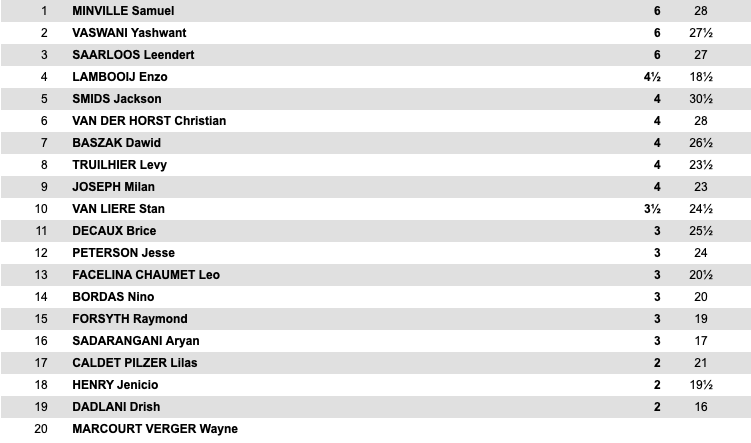 Au terme des 7 rondes, les trois joueurs terminent à égalité avec 6 points chacun. Le classement final s’est joué au départage, basé sur les points des adversaires, et Samuel Minville l’emporte de justesse (28 contre 27,5 pour Yashwant Vaswani).