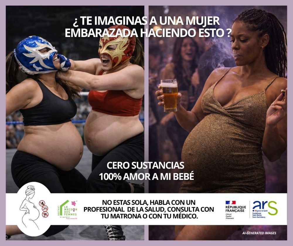 Le choix visuel est volontairement marquant : on y voit par exemple une femme enceinte faire du wheeling, de sauter en parachute ou encore de pratiquer la lucha libre. Des images fortes, destinées à provoquer une réaction immédiate. « L’objectif est de créer un choc visuel qui amène à faire le parallèle avec une réalité souvent banalisée, la consommation d’alcool ou de substances toxiques pendant la grossesse » explique la professionnelle.