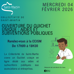 30.01.2026Ce mercredi 4 février 2026, de 17h00 à 18h30, se tiendra à la CCISM le lancement officiel du Guichet Unique des Aides de la Collectivité. L’événement se déroulera en présence de Louis Mussington,...